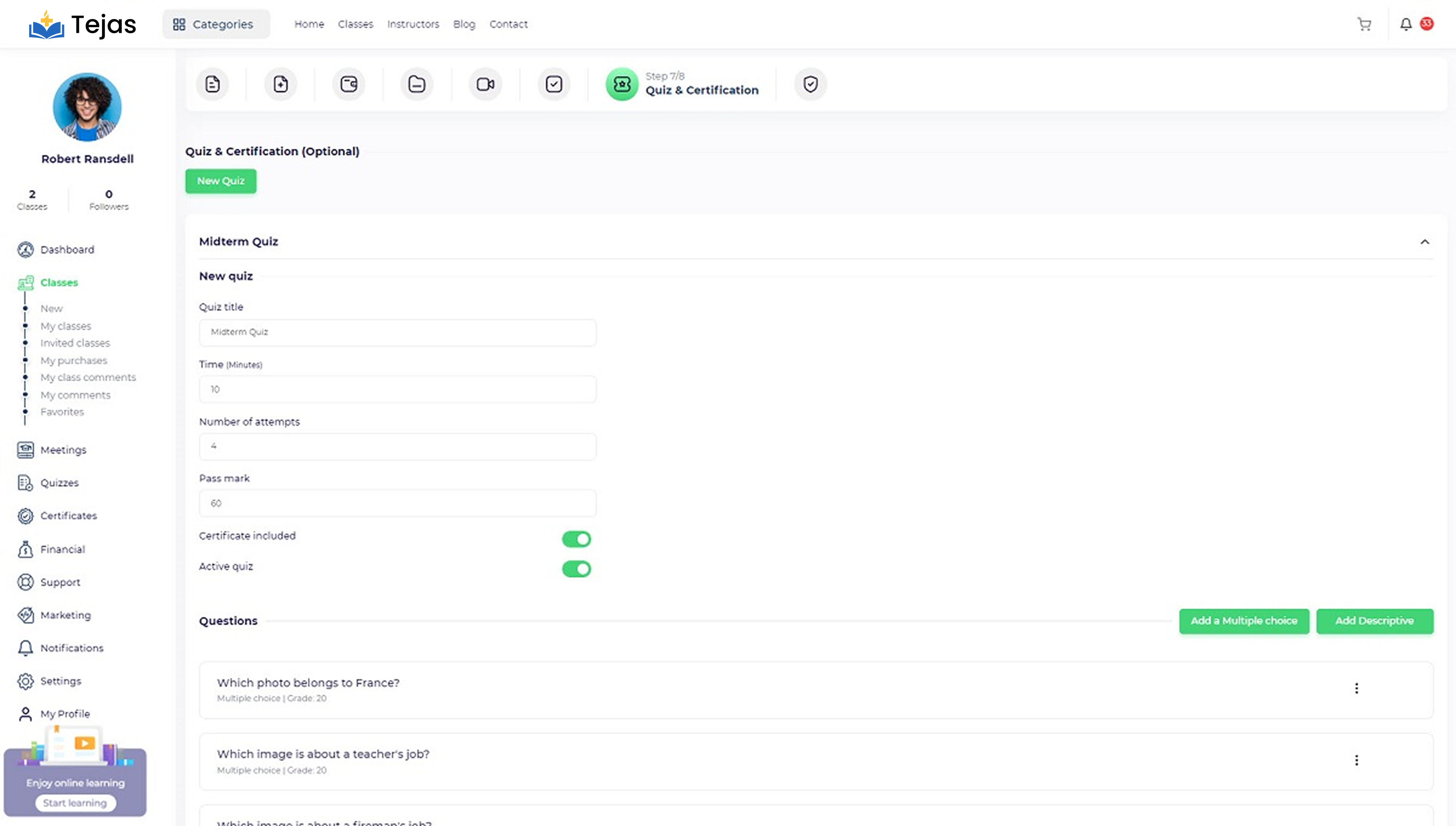 Partner instructor: If you want to invite another instructor to your course, you should turn this toggle on so the partner instructor dropdown will be displayed and you will be to add single or multiple instructors to the course. The invited instructor profile will be displayed on the course page and the invited instructor will be able to view the course through the “Instructor panel/ Classes/ Invited classes”.