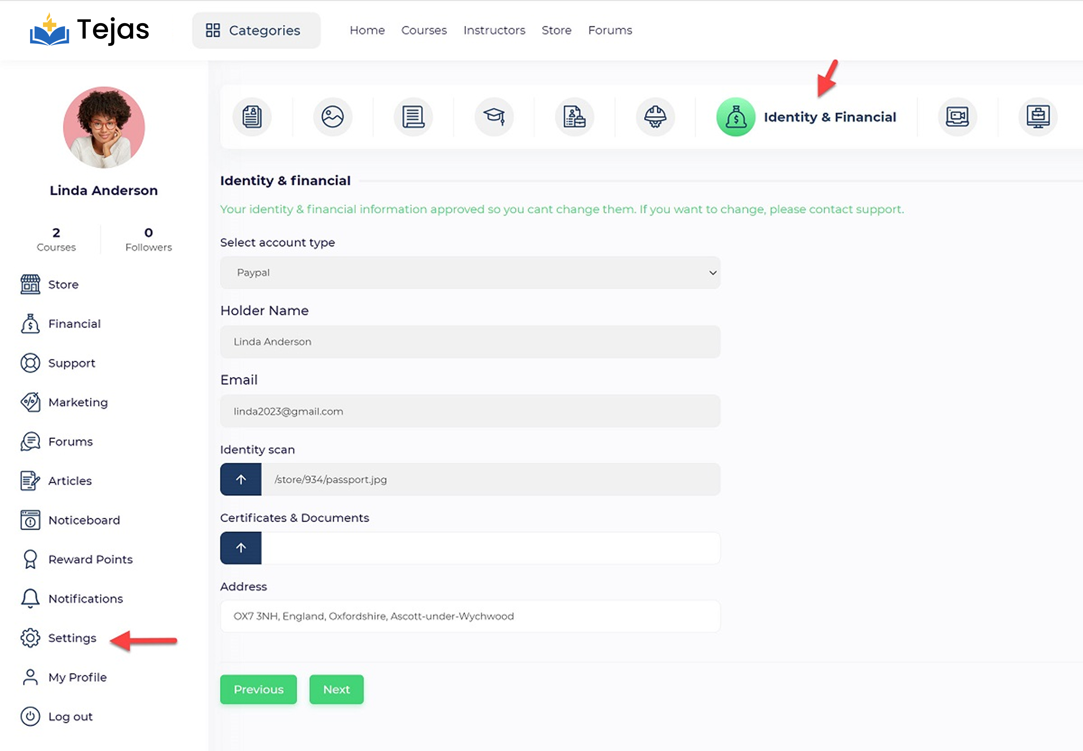 Users can define their payout account information from the “User Panel/ Settings/ Identity & Financial” menu.
